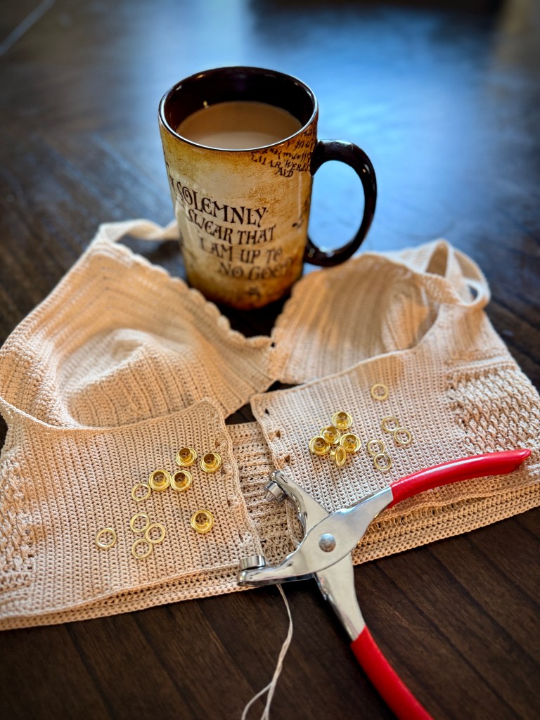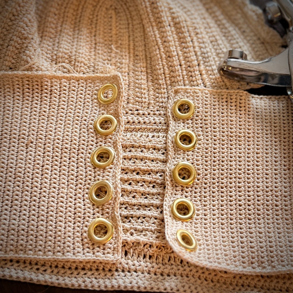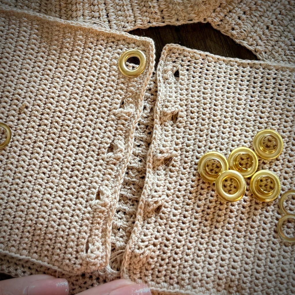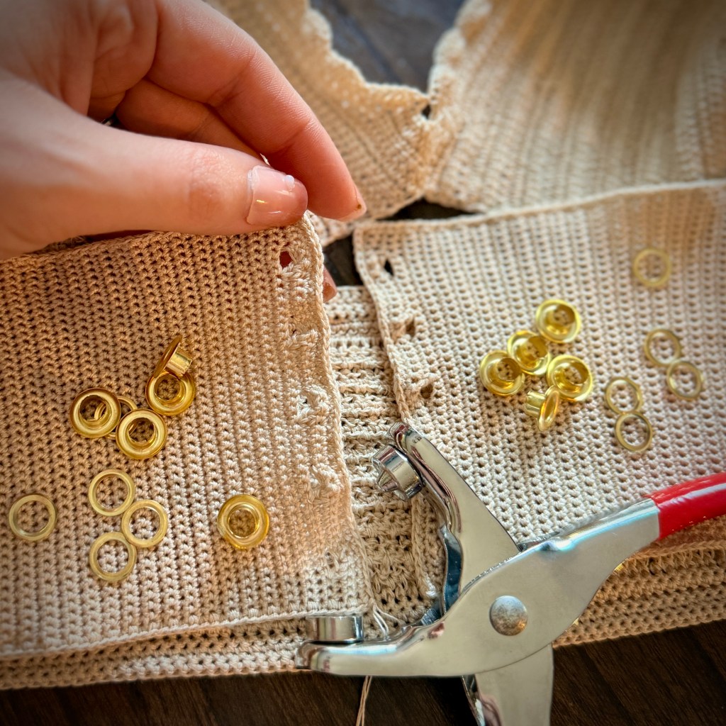 First and foremost I prep my top beforehand for adding the eyelets later on with crocheting gaps into the piece on either side.