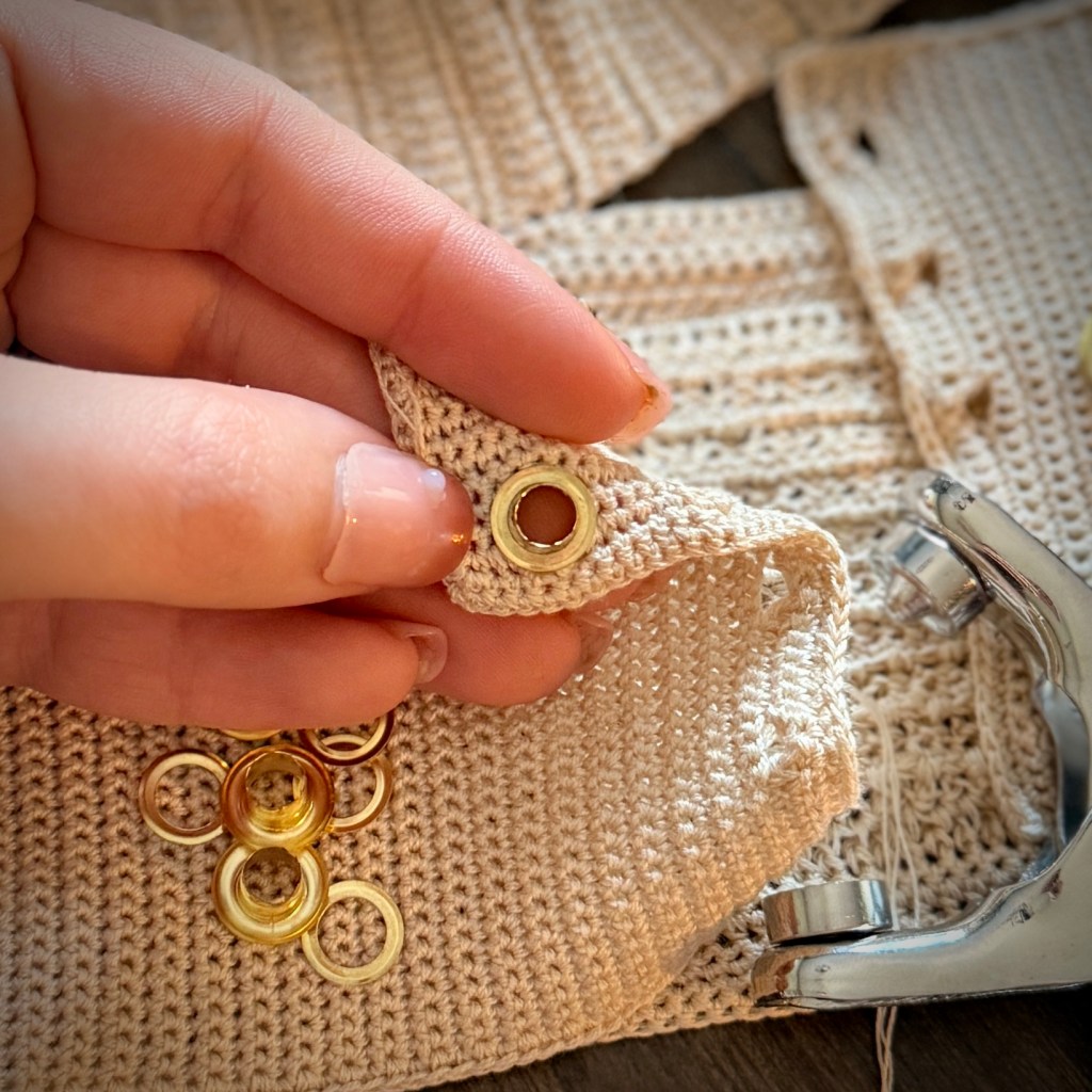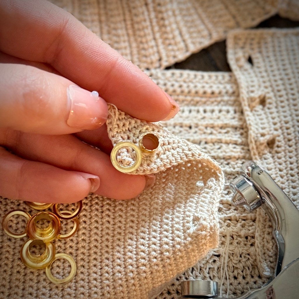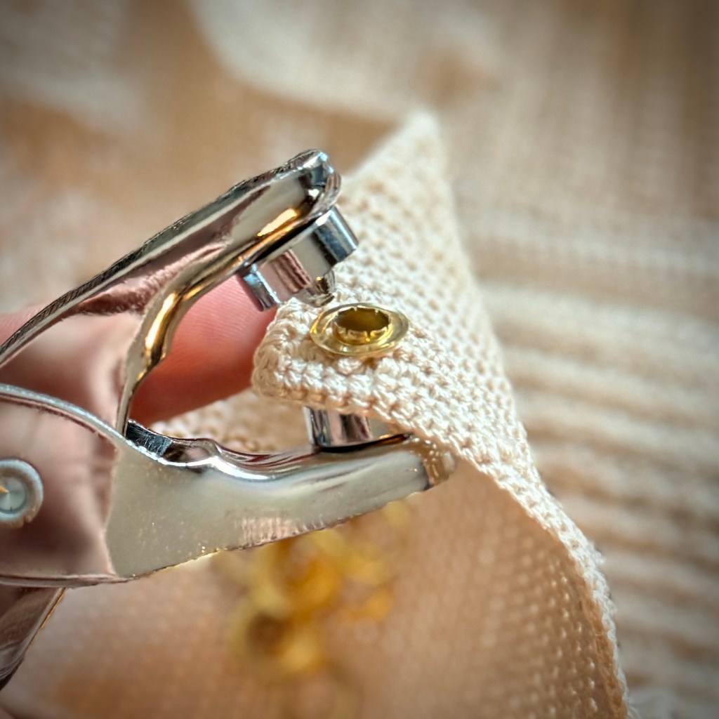 You’ll find next a series of photos to the process of adding the eyelets. The set I’m using I found on Amazon. Unfortunately the specific set I ordered the link is no longer an active listing, but anything similar will do the trick! It’s a super simple process I promise.