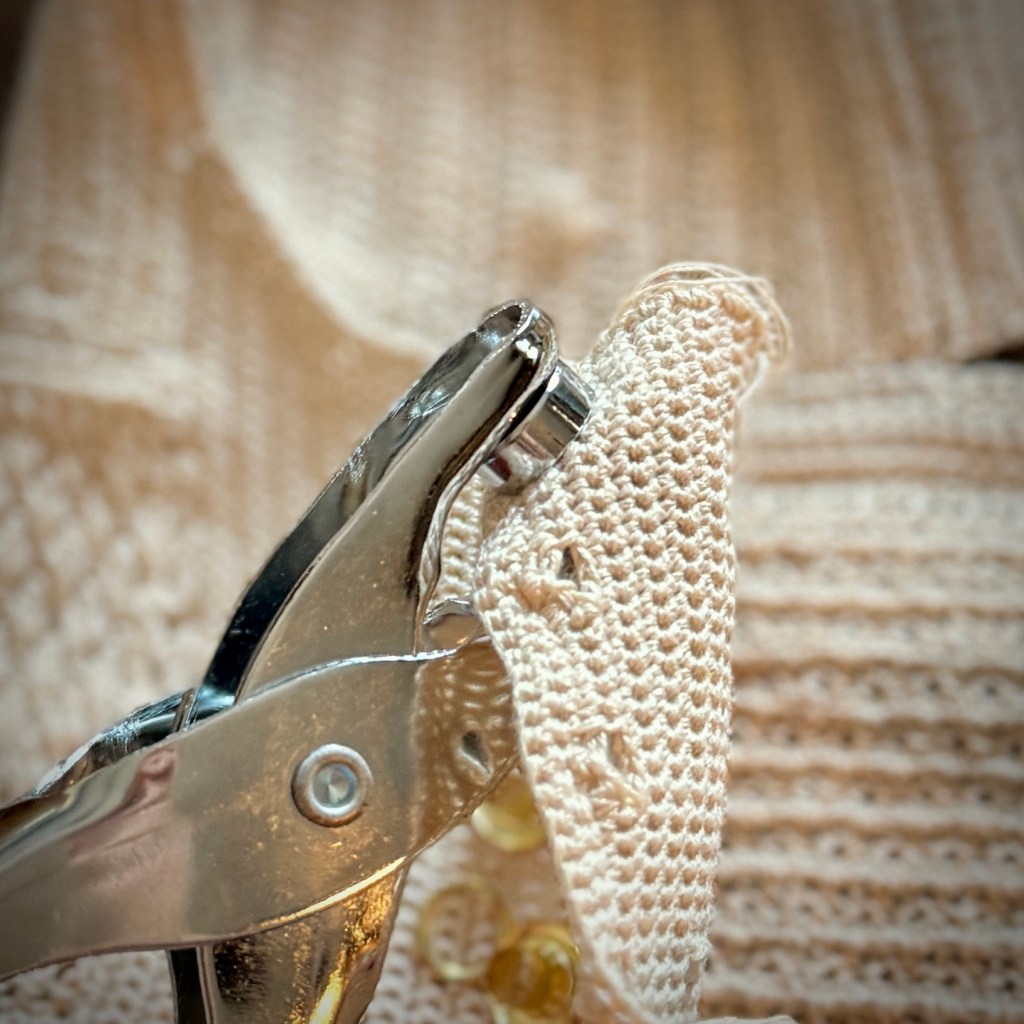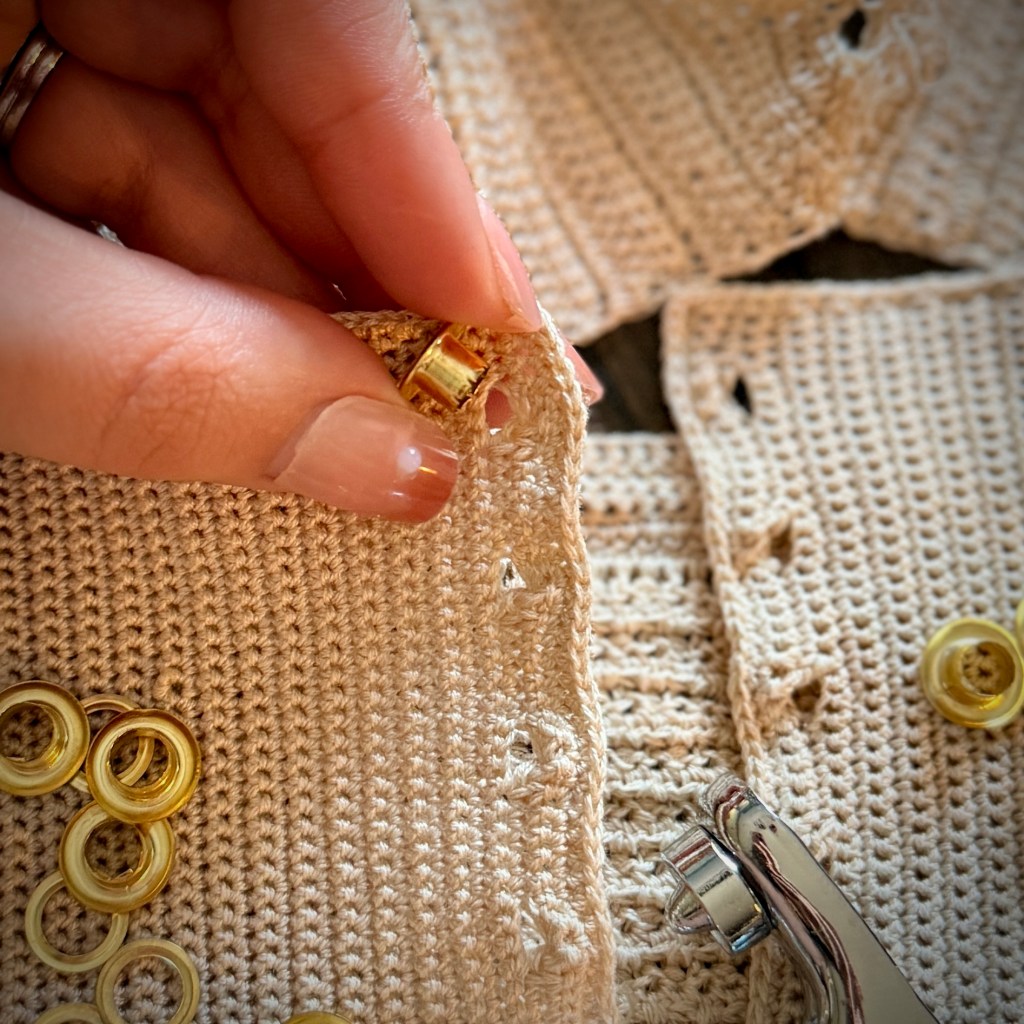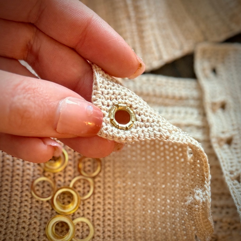 You’ll find next a series of photos to the process of adding the eyelets. The set I’m using I found on Amazon. Unfortunately the specific set I ordered the link is no longer an active listing, but anything similar will do the trick! It’s a super simple process I promise.